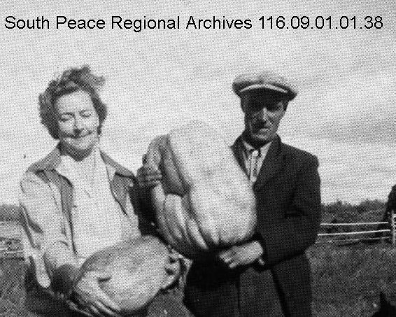 Photo from the Debolt & District Pioneer Society fonds 116  Photo description -  Bert and Doreen Crowe with their pumpkin crop.