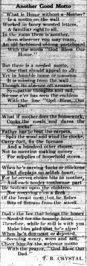 Another Good Motto – a poem for Fathers. “Dad’s the bee that brings the honey needed for the homely hive…”