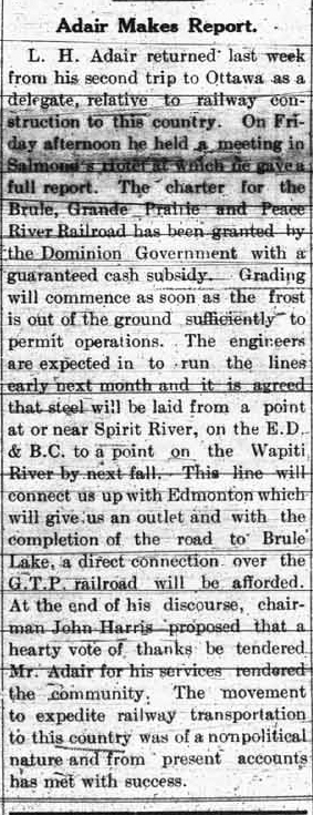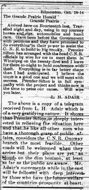 The result was that Adair spent two months in Ottawa promoting the railway. At first he was hopeful, as his Oct. 18th telegram below shows, but by 1915, he had focused his hopes on other railways. Who knows how much of his influence brought the Edmonton, Dunvegan & British Columbia Railway here in March 1916?