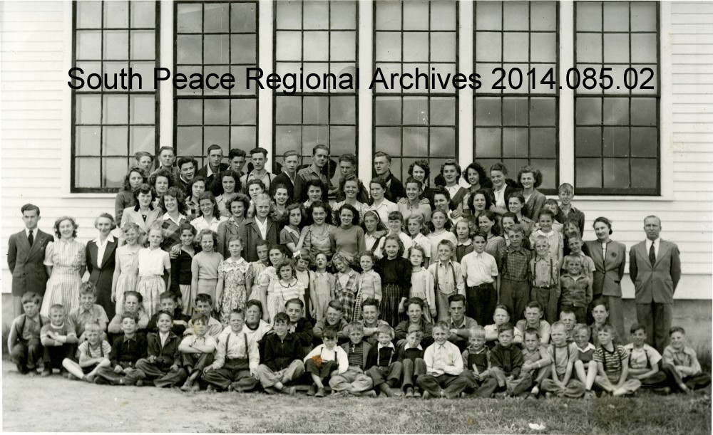 Hythe School photograph, taken inside the school gym, ca. 1950. Students are identified as (back row, l to r) Grant Finnon, ? , ? , ? , Jim Hodgson, Rene Sharkey, ? , Judy Armstrong, Dan Armstrong; (middle row, l to r) Laverne ?, Joyce ?, Donald Stubbs, Don Pearson, Veron Klimp, Bill Lanctot, ? Lizotte, Margaret Tangen, Art Patterson, Paul Gass; and (front row, l to r) ? , Tom Gass, Marion McPherson, Billy Fisher, Leroy Erickson, Teacher Vernon McNamee, Margarite Everton, David Stickney, Anita Hayjak, Leona Boey.