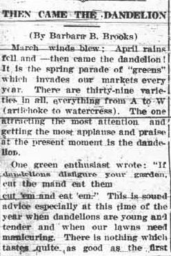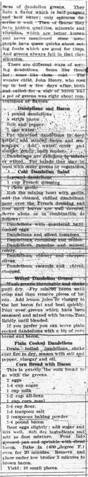 One thing I discovered when checking to see what I could find out about the use of dandelions in earlier times was that apparently the early colonists brought the dandelion to America from Europe.  Having someone to blame doesn’t help as much as I thought it might.  All parts of the plant were used; the roots were roasted and ground for a coffee-like drink, and frontier healers often recommended dandelion greens as a spring tonic.  They are full of vitamins unavailable to pioneers during the winter (Carol Williams, Backwoods Home Magazine).  The leaves are the nutritious part, but you can also make wine or cookies with the flowers.