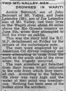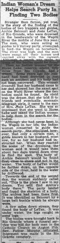Just as the article says, this story is stranger than fiction. A woman from Horse Lake had a dream about where to find the bodies of two men who had drowned in the Wapiti River nearly two months earlier. It’s unfortunate that the woman was not identified in the report, and some follow up information about her would have been interesting.
