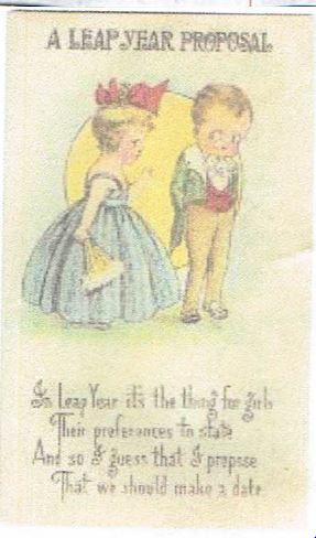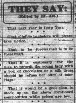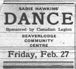 There are many traditions about Leap Year which say that women may propose to men on February 29.  Many countries had specific penalties if the proposal was refused, so it was a win-win situation for the woman – she either got a husband or leather gloves, roses, enough fabric to make a skirt or a silk gown, for example.  In some parts of Europe the fine was twelve pairs of gloves, assuming the woman would need a lot of gloves to wear to hide the embarrassment of not having an engagement ring.  The Sadie Hawkins Day tradition originated in the Li’l Abner comic strip and inspired “real world” Sadie Hawkins dances, where the girls asked the boys out.  Sometimes the Sadie Hawkins idea gets intertwined with Leap Year, as in this ad for a dance in Beaverlodge in a leap year.