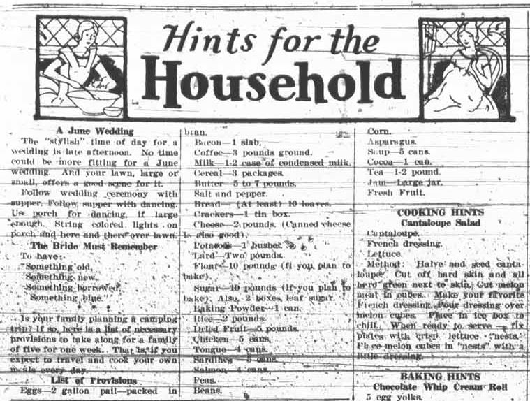 This column also gives a list of provisions for a one week camping trip for five people. I compared it with the list I used for camping trips and find this one sadly lacking. No chips, no steak, no beer, Coke, or other necessary beverages! It also looks to me like the poor mother will spend as much time cooking on a camping trip as she would have at home, but without the conveniences. We certainly have it better today.