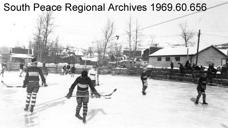 The headline for the article about downtown Christmas lights was “Grande Prairie in Blaze of Light for Holidays.” The hockey article’s sub-heading was “New Lights Made Rink as Bright as Day.” It occurred to me while trying to decide between the two that what they had in common was how entrancing all the lights were to the people of that time. While we are used to all the bright signs, street and highway lights, even all the lights in and outside of our homes, back then a lighted hockey rink and a main street decked out in Christmas lights were still a bit of a novelty and somewhat of an indulgence. I especially like to picture the huge star on the old water tower, eighty feet in the air.