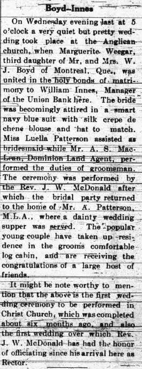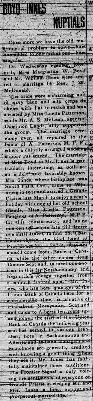 Having two newspapers in Grande Prairie must have been quite a challenge for the editors and writers, as in a small town there is only so much news to print. These accounts of the same wedding really highlight the different styles of the editors of the two newspapers – one pretty straightforward, the other fairly flowery. It was likely difficult for The Frontier Signal in this instance, as his report of the wedding appeared in the paper published six days after the account in The Herald.