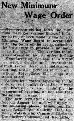 With the minimum wage set to rise from $10.10 per hour to $11.20 per hour on October 1, 2015, I thought this article was an interesting perspective on how things have changed over the years. Alberta established a Minimum Wage Board in 1922, after several other provinces, but was the first to enact minimum wage legislation, and the first to enact a fixed statutory minimum for men and women. Note that the wages given in the article are per week! Also worth noting is that only certain places in the province were bound by the new law, and only for specified occupations. I didn’t find numbers for the early years, but by comparison, in 1965 the minimum wage was $1.00 per hour for urban areas, and $0.95 for non-urban.