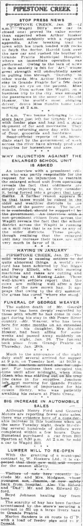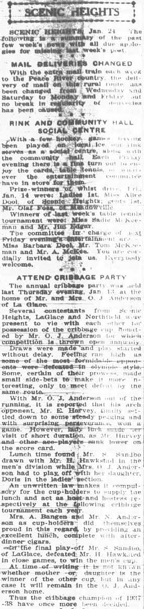 In the January 27, 1938 issue of the Northern Tribune, the area news columns from Scenic Heights and Pipestone Creek caught my eye. The Scenic Heights writer does a detailed item about a local cribbage tournament which was an annual event in the area, with trophies and bragging rights. The Pipestone Creek article starts off with “Stop Press News,” which is bound to get attention, and follows with several other interesting items, including haying in January, an injunction against an enlarged school, and the annoyance of the night staff (at what one assumes was a local cafe) at having to make supper at 9:00 PM.