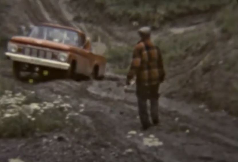 Image: A film still showing a pickup truck travelling along a muddy trail (SPRA 198.02.02, Fonds 198: Ward-Marcy family fonds)