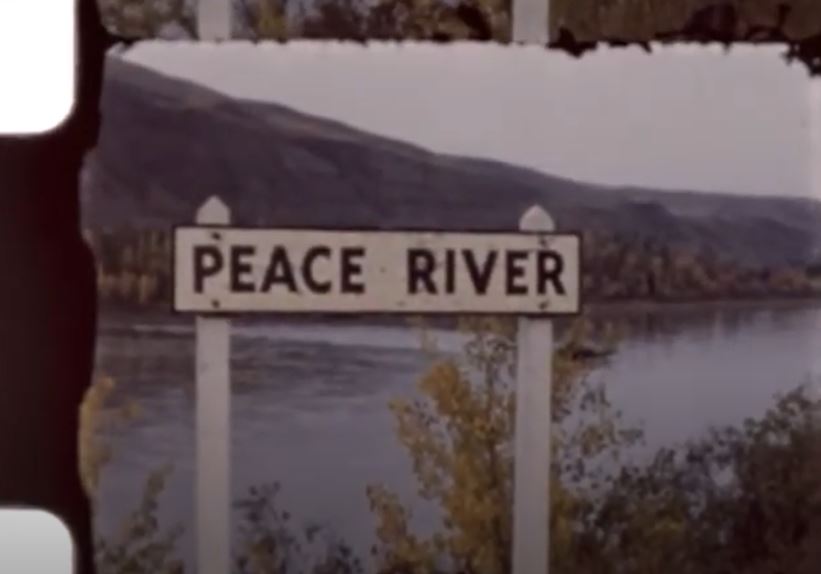 Image: A film still showing a Peace River sign (SPRA 449.01.20, Fonds 449: Foster Family fonds)