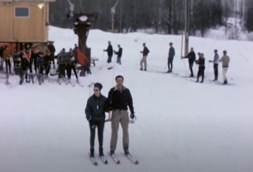 Image: A film still depicting two people riding a T-bar ski lift (SPRA 1974.74.22C, Fonds 138: Griff James fonds)