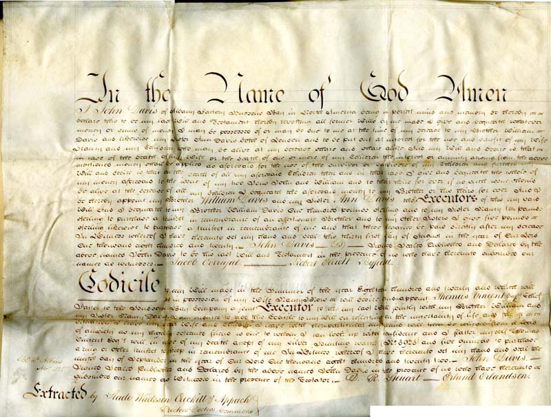 Researchers often look for documents to help them answer their research questions. Often though, documents raise more questions than they answer. The 1820 Will of John Davis is an example. Most genealogy websites or historical websites that write about John Davis, HBC Factor and Master from 1803 to 1824, state that he and his wife Nancy (or Ann) had five children: Ann Nancy, Francis (Elizabeth?), Mathilda, Catherine, and George. And yet, in his will, John Davis writes;