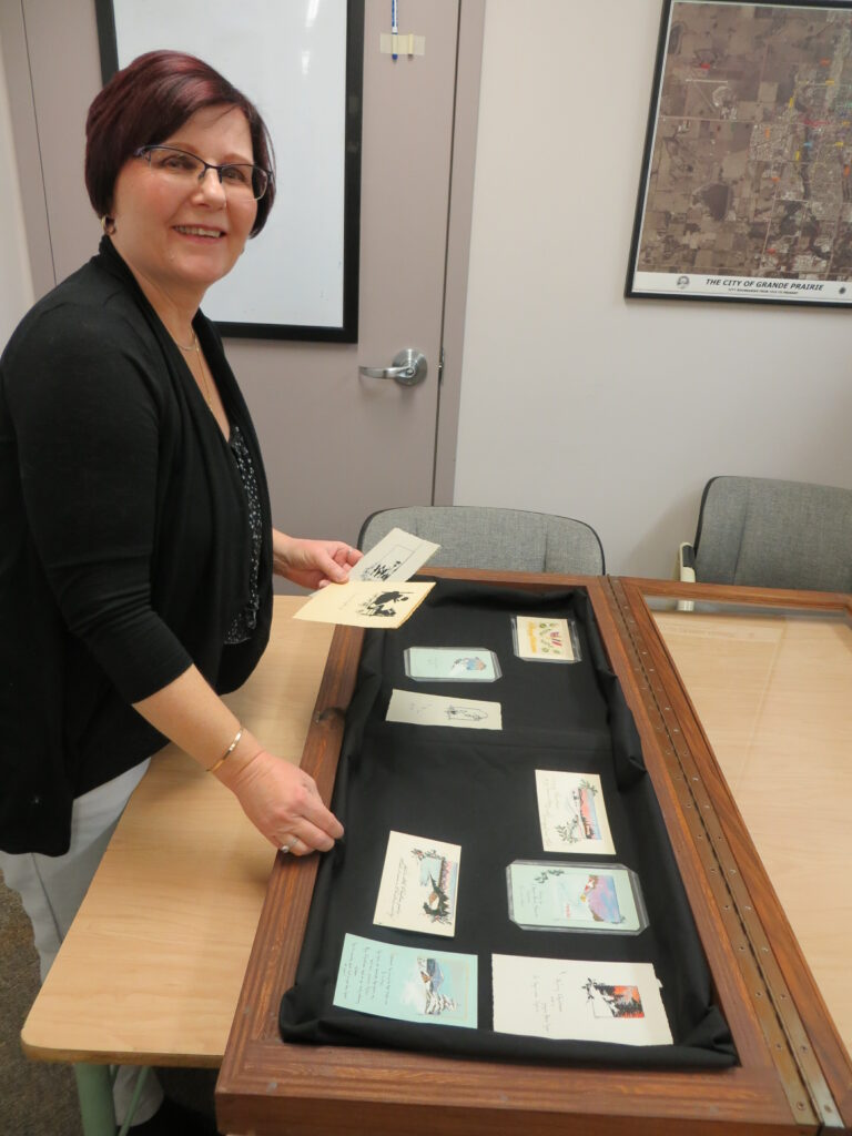 Archives Technician Donna has been busy this morning curating her first display of archival artifacts. The display will be used by the Grande Prairie Museum’s education department to supplement their programming activities.