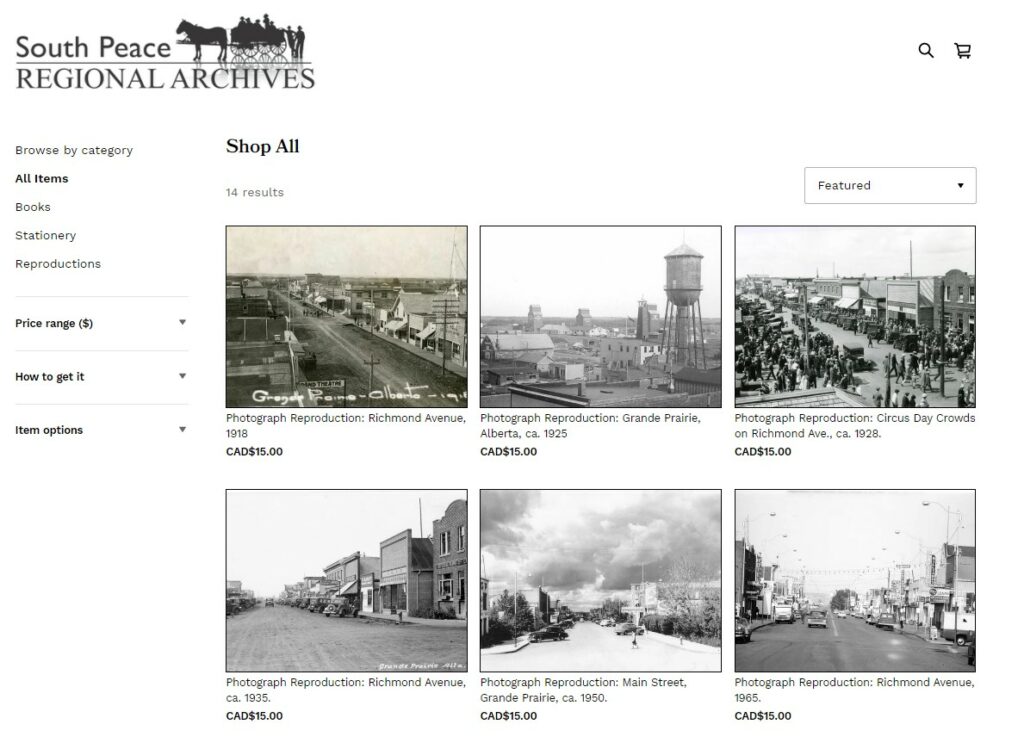 Phase 4 of the Downtown Rehabilitation begins next week in the City of Grande Prairie and will continue throughout the summer. This construction project marks the newest chapter in Grande Prairie’s continuous development. Richmond Avenue has a rich history of community and commerce, as the location of many early businesses and social activities. To mark the newest phase of construction, the South Peace Regional Archives is taking a look back on downtown… by launching a series of photographic reproductions in our online store!