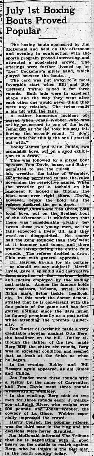 There are many articles about boxing matches in the old papers, and I usually just skip them. I started reading this one and right at the start was intrigued by the idea of a band playing between the bouts. I also found the idea of a match between a wrestler and a boxer, each following the rules of his own sport, quite fascinating. Overall, it seemed like a pretty good day of entertainment at the First of July sports.