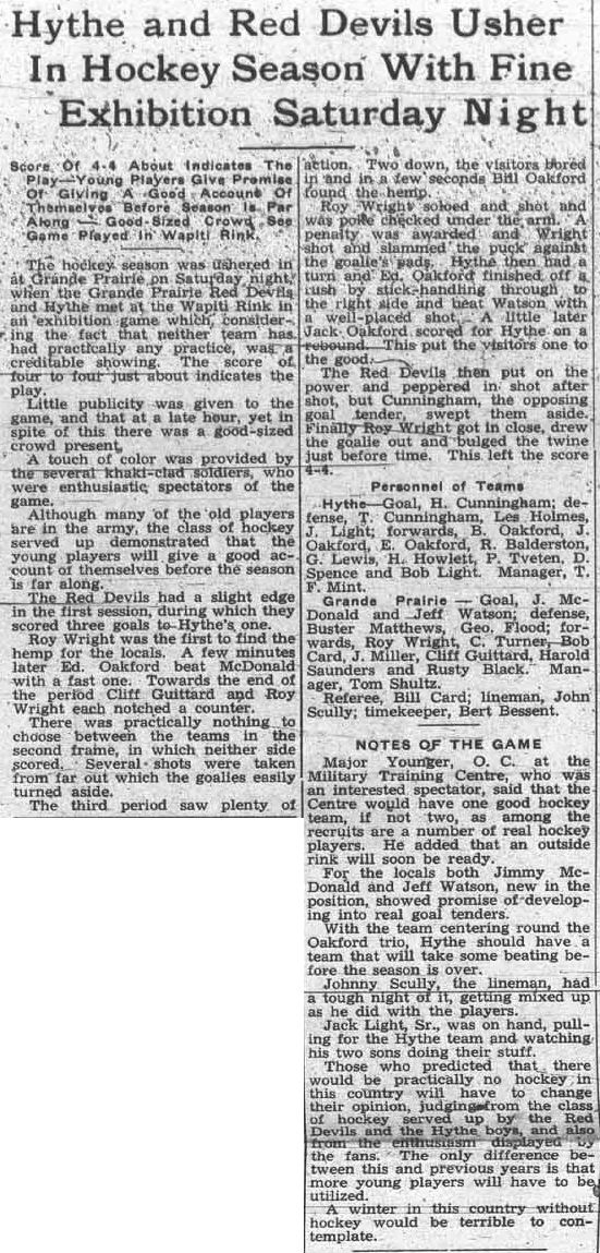 There had been predictions that there would be no hockey in the area because many of the players were in the army, but it turned out that the younger players gave a good account of themselves in the first game. A late start to getting ice made resulted in the teams having little practice. An officer from the Military Training Centre was present and stated that they would soon have an outside rink ready, and the Centre would have at least one team from among the recruits. The second article announcing the next game mentions that some of the Sexsmith players had been skating on local ponds to get in shape. A far cry from the way things are now!