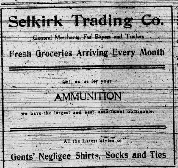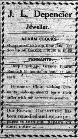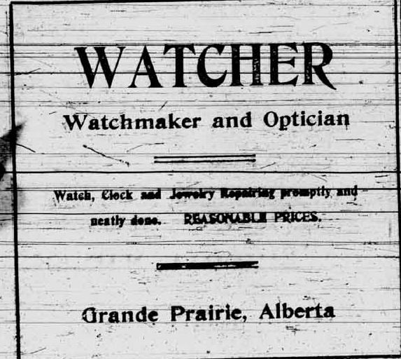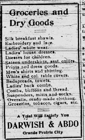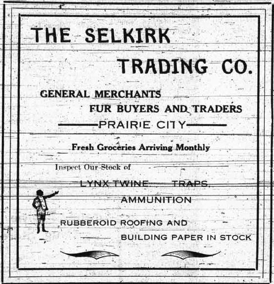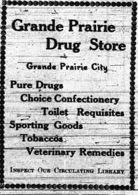 2005.06.04 Retail trends are always changing, and it seems like now we have come back to the idea of being able to buy everything in one store, from groceries to hardware to clothing. This was the kind of stores which first opened in Grande Prairie in the very early days. Ads from the newspapers show what a mix of merchandise and services were available in the local stores in 1913-1915. Remember that this was before the railway reached Grande Prairie, and everything had to be brought in by stage over the Edson Trail.