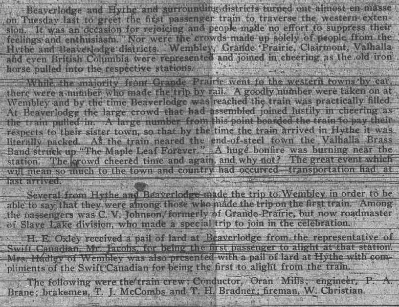 Five years after the rail line reached Wembley in 1924, it was extended to Beaverlodge and Hythe. There were huge celebrations in both towns, including brass bands, a huge bonfire, and banquets with over 200 people attending in each town. Many drove from Grande Prairie and area to witness the event, others drove to Wembley and rode the train to be passengers on the first one. Who wouldn’t, with the “prize” of a pail of lard at the other end!