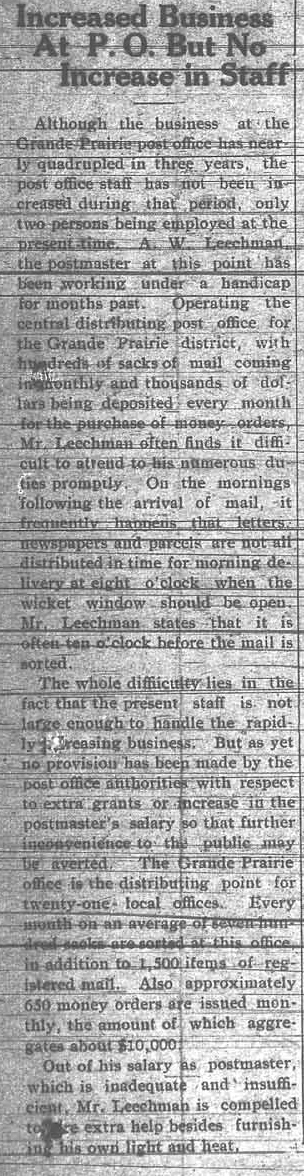 Having just had a card from Smithers, BC take two weeks to get here, I wasn’t feeling to happy with the Post Office, but the old Postie in me reacted with indignation to this article from 1917. Business had quadrupled but the number of staff remained the same. I was also surprised at the quantity of mail coming in this district at that time. 700 sacks of mail a month is a lot; that’s over 23 a day, plus 50 registered letters a day, for the 21 offices in the area that Grande Prairie distributed the mail to.
