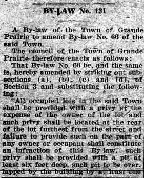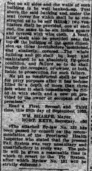 This weeks item appeared in the Oct. 12, 1925 issue of the newspaper and is not an issue that our current Council has to deal with! Most By-Laws are pretty dull reading but this one explains very precisely how to construct a privy that will meet the requirements of Town Council. A politician said the government has no business in the bedrooms of the nation, but apparently the government had great interest and control over how you go about your ‘business’! In all fairness to the local Council, the article does explain that the By-Law was recommended by the Provincial Health Inspector.