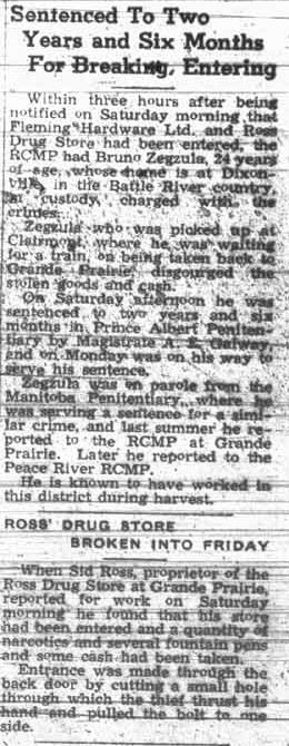 On a Friday night in 1946, a fellow broke into two businesses in Grande Prairie.  Saturday he was in custody and sentenced, and on Monday was on the train to the Prince Albert Penitentiary.  He was well on his way to prison before the newspaper reports of the break-ins and his capture appeared on Thursday.