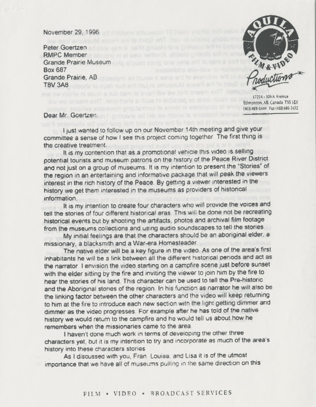 The item we are highlighting this week is a letter by Mike Dodson, producer for Aquila Productions, to Peter Goertzen, regarding his plan for the Spirt of the Peace Promotional film, eventually named “Discover the Spirit of the Peace”. This letter in in the Spirit of the Peace fonds (fonds 007) and is available in its entirety on Alberta on Record. Dodson proposed that the principal narrator will be played as a Native elder, introducing the early history and each episode. This 1996 proposal imagines an Indigenous elder, yet the final production eventually would be performed by a non-Indigenous actor and the script will not be written by local Indigenous knowledge-keepers or elders. During the time this project was conceived, issues of cultural appropriation were not yet widely raised or debated, as they would be by the years following 2000.