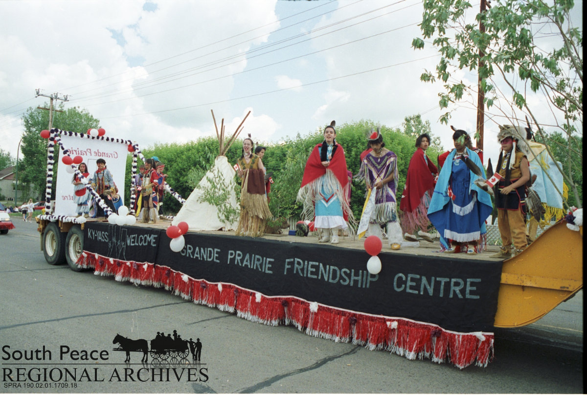 A feature of Canada Day Parades for over 30 years has been the float contributed by the Grande Prairie Friendship Centre, featuring children, and sometimes Elders and other leaders in traditional and more modern dance regalia. The Friendship Centre in Grande Prairie was founded in 1965 and has a provincial and national profile, offering a wide variety of programs from Headstart for children through to food banks, cultural events and Elder services. This week’s image is from the Panda Camera fonds (fonds 190). Paul Pivert’s photography firm, Panda Camera, was called upon to record many community events, mostly in the commerce and industry sector, but he made a point of covering parades, including images of Friendship Centre and any other Indigenous participants.