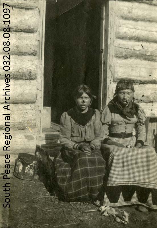 Our caption describes this photo (SPRA 0032.08.08.1097) as “First Nations Women, ca. 1914. Two First Nations women sitting on the steps of a log cabin.” This photo is a part of the Campbell family fonds. Isabel Campbell made numerous contributions to preserving the history of the Peace Country, including photographs like this one which document Indigenous people of the region.