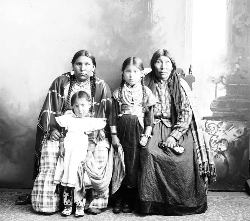 Unlike many photographs taken of Indigenous people, this family is largely identified: Michael Buffalo’s family from the Hobbema First Nations in Central Alberta, left to right: Bella, Mary (Nepoose) Buffalo, Margaret, possibly Peggy (Allard) Buffalo, Michael’s mother. It is unknown who originally commissioned these images and for what purpose. Similar images in the Field’s Studio fonds were printed as postcards, which suggests they were posed for commercial reasons. Whatever the original intent for the photograph, for descendants researching their history, images like these can help make important connections to their past.