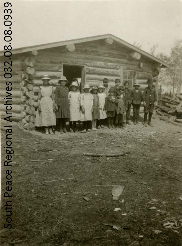According to our records, the Catholic brothers at St. Vincent’s Mission on the banks of Bear Creek initially taught lessons to the local Indigenous children starting in 1908. In 1910, the town site for Grande Prairie was laid out on the other side of the Creek and public, one-room schoolhouses started popping in the town and in Flying Shot Lake. All the local Indigenous children went to those schools, including the one pictured here. We do not know if the children pictured here are really Métis, Cree, Iroquois, or Beaver largely because we do not know their names.