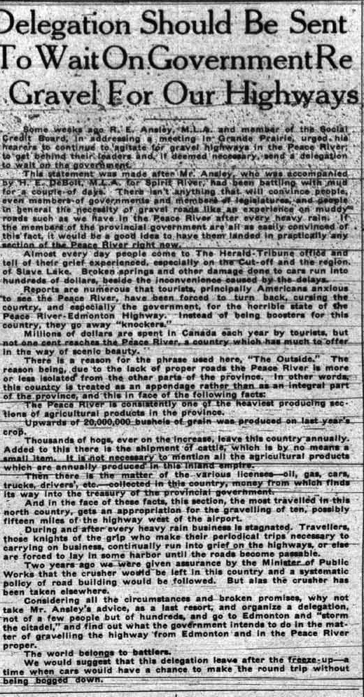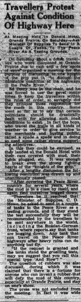 “Any tank that can travel on the Peace River highways after heavy rains can do anything but fly” was the consensus of a meeting held by commercial travelers in the Donald Hotel. I am guessing that this was a pretty informal meeting, probably held in the ‘beverage rooms’ of the hotel. Nonetheless, the road situation was serious, and another article on the same page suggested urgent action to get the government to deal with the need to gravel the roads. This item addresses the perceived lack of interest in this area by the government – “this country is treated as an appendage rather than an integral part of the province.”
