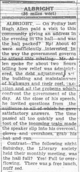 The January 26, 1934 issue of the Grande Prairie Herald included several pages of notes from the rural communities of the South Peace region. Whoever the writer, or writers, of these “Seen & Heard” columns, they were well informed of the day to day happenings of their communities… and had a subtle wit besides.
