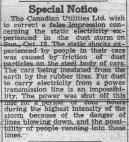 The price of bread seems like an odd issue to concern Town Council, but they also dealt with angle parking on main street, new street lights in the north end, and the whereabouts of band instruments purchased by council several years before. Also in that paper was a special notice from Canadian Utilities concerning static electricity which shocked people in their cars during a major dust storm. It must have been some storm…