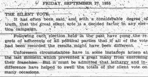 With Civic Elections coming up on Monday October 21, this excerpt from the Editorial of September 27, 1935 seemed appropriate reminder that votes not cast don’t count!