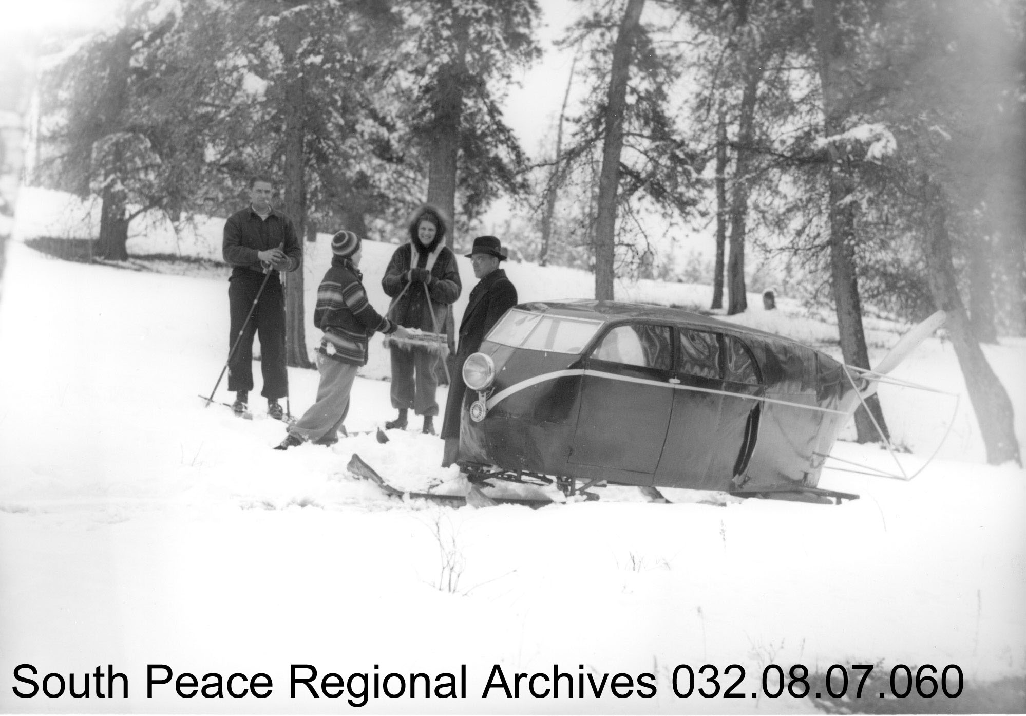 The photo includes Jack Alloway, Mr. & Mrs. McQuat and daughter beside their snowplane on the Wapiti Trail. This early form of the snowmobile, made by George McQuat, was used for such emergencies as taking doctors to patients (or vice versa) or entire hockey teams to a game when the roads were drifted. Obviously taking hockey players to a game would have been considered emergency travel!