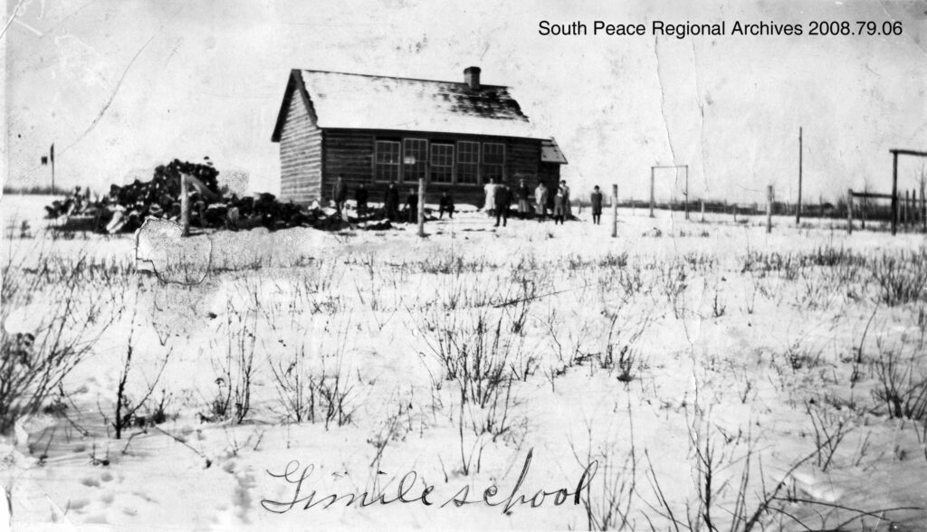 Image: The original Gimle School, built west of Albright in 1919, with students in the yard. 1930 (SPRA 2008.079.06)
