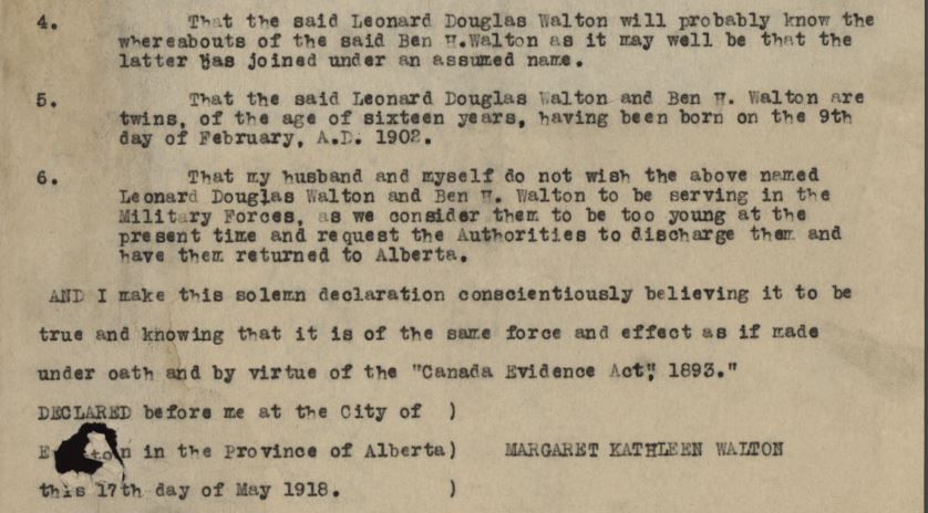 Leonard was born in Ontario on February 9, 1902; he lied about his age on his enlistment form, stating that he’d been born in 1898. In 1918, he and his twin brother Ben joined the army without telling their parents, although they were significantly underage (see page 39 of Leonard’s service file). Not surprisingly, their parents wanted the boys sent back home, as they were too young to have enlisted. Their mother wrote a letter dated May 17, 1918, requesting that her sons be discharged. Leonard was discovered to be underage in July of 1918, after he had reached England. He was sent back to Canada and officially discharged on November 24, 1918. In 1920, Leonard filed on SE 27-77-20-W5 and NE 33-77-20-W5. Leonard died on March 8, 1958.