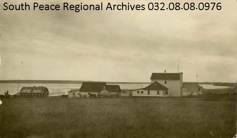 Image: Lake Saskatoon with the lake in the background. The caption on the back of the photograph states: “Peace River Trading Co. Ltd trading post at Lake Saskatoon, Grande Prairie section of Peace River district, Northern Alberta. Lake Saskatoon in background. October 3 – 1917. V. Lloyd-Owen.”