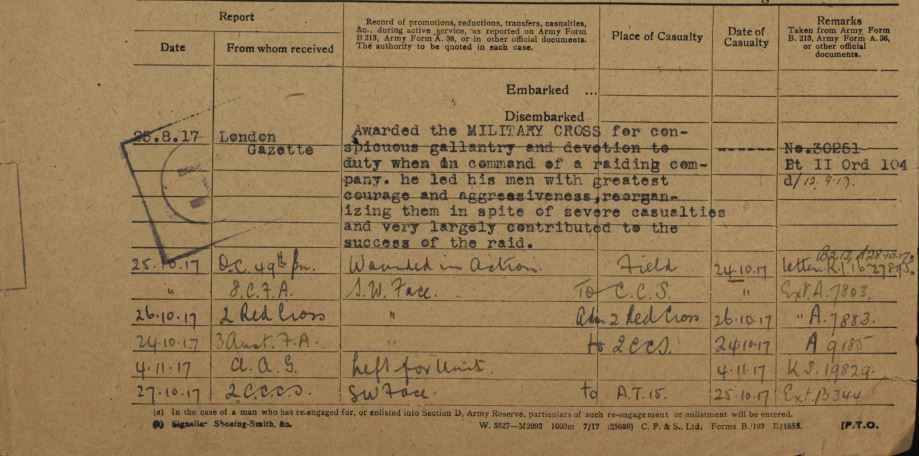 “Awarded the MILITARY CROSS for conspicuous gallantry and devotion to duty when on command of a raiding company. He led his men with greatest courage and aggressiveness, reorganizing them in spite of severe casualties, and very largely contributes to the success of the raid.”