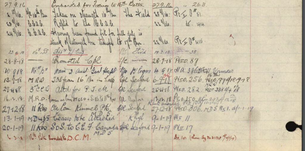 Image: excerpt from Emile’s military service file, including a note about his Distinguished Conduct Medal (Library & Archives Canada)