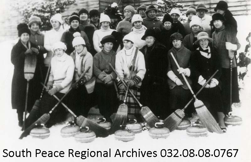 Image: Group photograph of the Grande Prairie Ladies’ Curling Club posed with rocks and brooms. Edith is second from right in the back row. ca. 1925 (SPRA 032.08.08.0767)