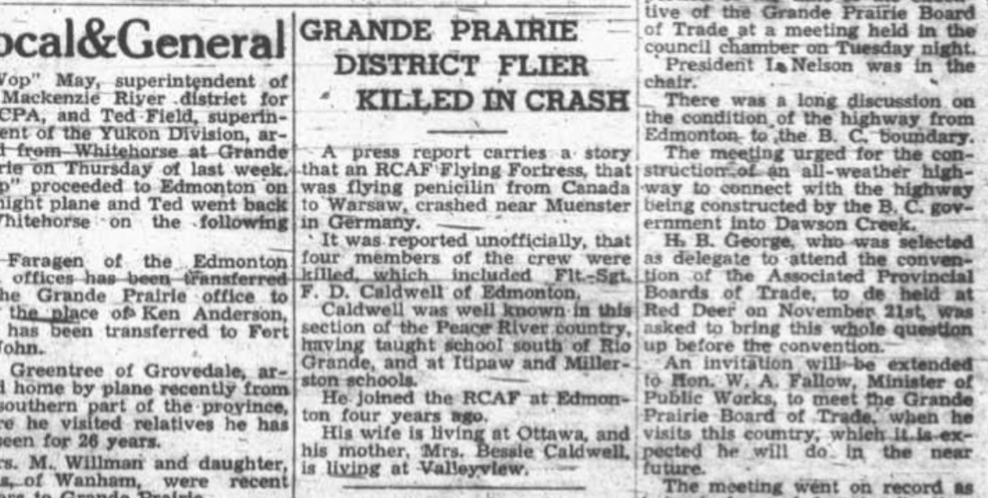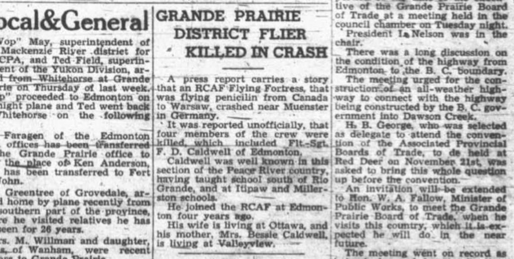 Born in 1913, Donald Caldwell was one of 9 children of parents Bert and Bessie May Caldwell from Valleyview. A teacher by profession, he taught in Rio Grande area, Itipaw, and Millerston AB. Donald was married to Margaret Isobel from Ottawa. During the Second World War he enlisted with the RCAF in 1941 in Edmonton, became a pilot, and served for 4 years. After the war Donald and 4 other pilots volunteered to fly penicillin from Canada to war-torn Warsaw, Poland. Tragically all five crew members of the RCAF Flying Fortress were killed when their plane crashed near Muenster, Germany, on November 4, 1945. Poland awarded these five service men the Golden Cross of Merit for “their outstanding heroism while on a mercy flight.” Donald was 32 years old, and he was buried in the Muenster Heath War Cemetery in Germany. The Grave Reference is 4.F.18