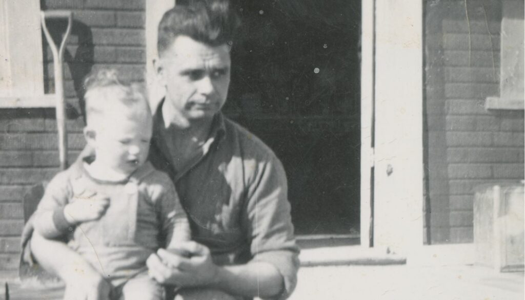 Image: Fred Darnton sits with a small boy on a front step, possibly of a store, 1935 (SPRA 116.09.01.02.022). Cropped.