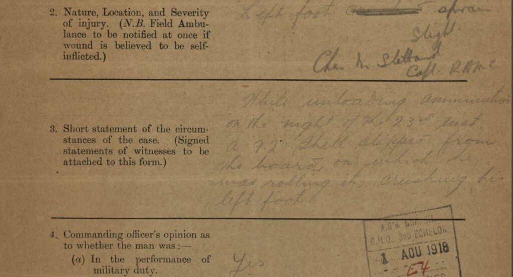 Image: An excerpt from George’s military service file with details about his injury (Library & Archives Canada)