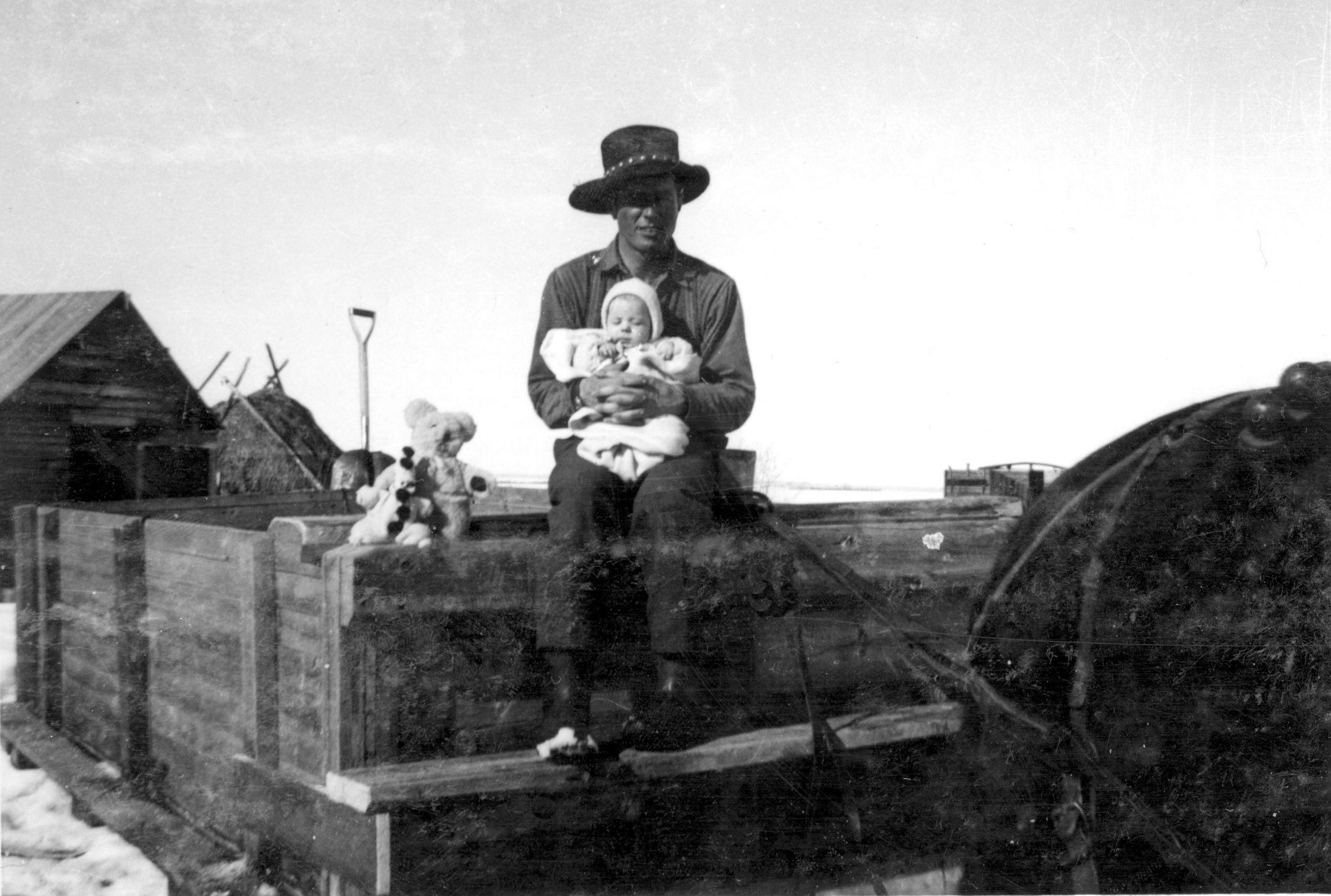 Image: Jack Conrad holding a baby while sitting on a horse drawn wagon, 1945 (SPRA 259.08.09)