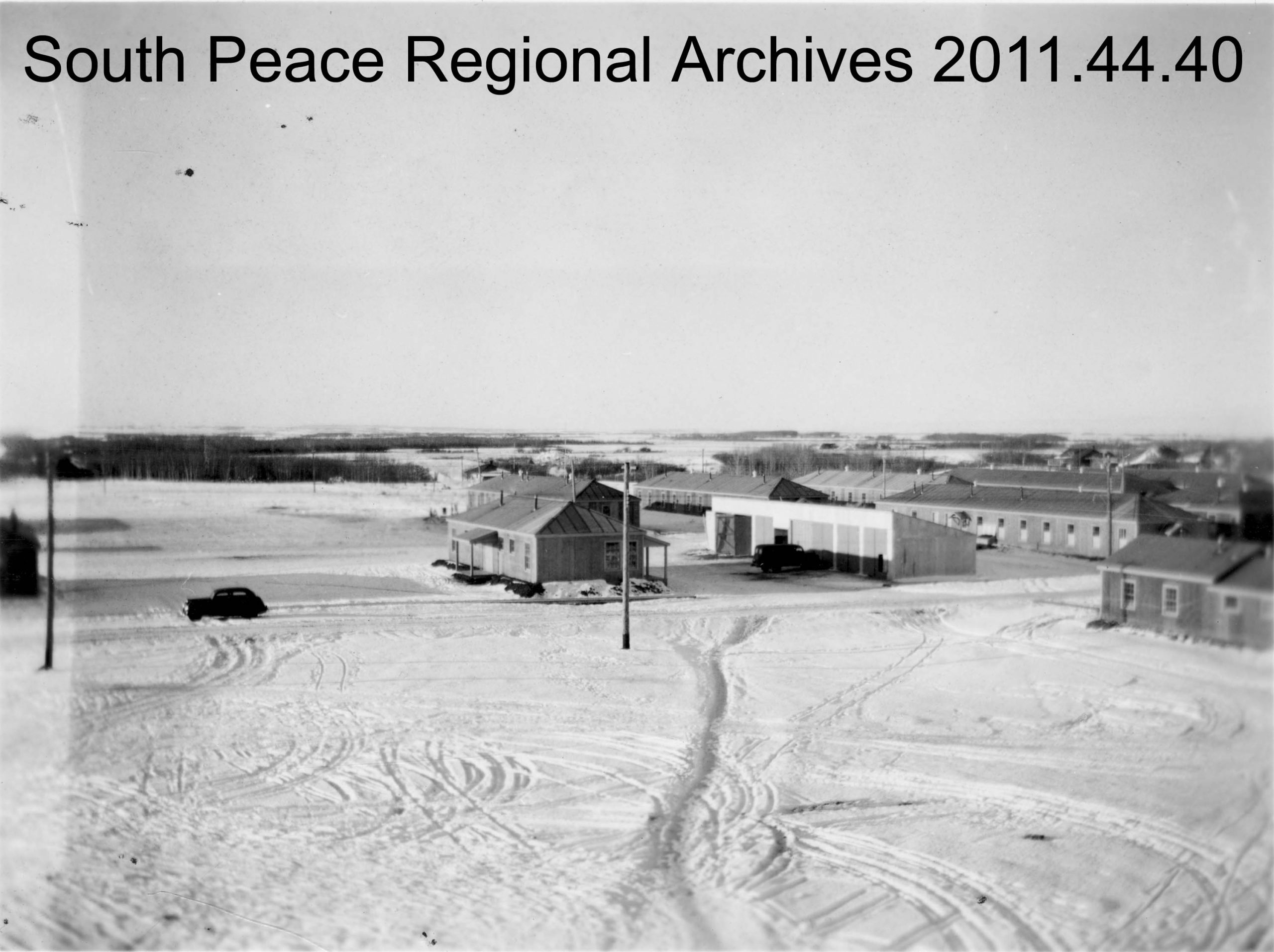 Image: A bird’s-eye view of several buildings, including “H” huts on the Grande Prairie Army Training Centre grounds, ca. 1941 (SPRA 2011.44.40, Fonds 478)