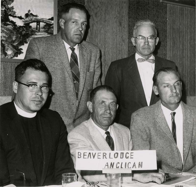 Image: Representatives of Beaverlodge Anglican Church. Front row: Rev., Les Harris, Sam Martin. Back row: __ Walker?, Leslie Emes, ca. 1950 (SPRA 032.08.08.0056)