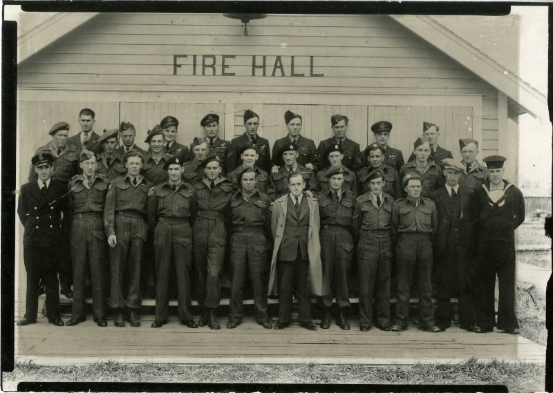 Image: The returning Sexsmith soldiers after WWII. Back – Bill Card, Dan Rycroft, Simon Haakstad, Jack Campbell, Andy Innes, George Cameron, Dale Harris, T. Copeland, Samuelson. Middle – J. Bond, G. Gerow, E. McDonald, G. Rix, Scotty Boyd, J. Siluch, Bryce Burns, L. Rasmussan, D. McNaughton, T. Forsythe Front – Jack Waters, H. Knight, B.Brown, L. White, C. Foote, C. Thomson, D. Wright, B. Murray, G. Kusyk, B. Moody, G. McQuitty, J. Thorpe. Photographer’s stamp: Art Craft, Grande Prairie, Alta. 1945 (SPRA 0644.01.08)