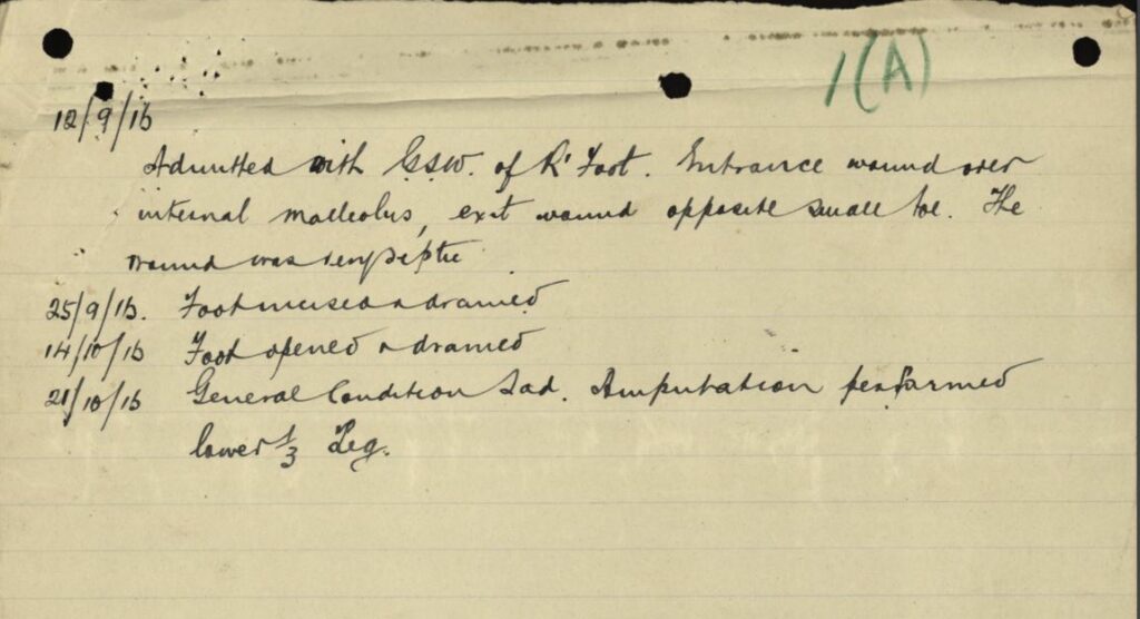 I suppose you will be quite surprised to hear from me; however, as I am living in my bed at the above hospital I thought I would write you a few lines. We arrived in Liverpool on the 7th May 1916 and there went to a place called St. Martin’s Plains and from there I was drafted in to the 8th Bttn. and went to France in June. I was in the battle of Ypres in June and also was at the Somme when I got hit in the left ankle, and I have finally lost my left foot, it is cut off about 5 inches above the ankle, so my chances are pretty good for getting back to Canada once more. Well Bill, you people have no idea of the war, but I can tell you that it is simply hell.
