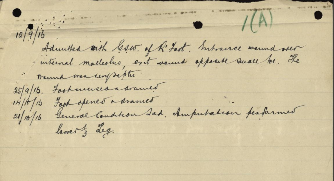 Archie had accidentally shot his foot while cleaning his rifle on September 10, 1916. His medical records state that he “was struck by rifle bullet in ankle accidentally by discharge of his own rifle. Foot was badly shattered. Wound became very septic requiring amputation which was performed Oct. 21, 1916.” It was later reported in the Grande Prairie paper that Archie came back to Canada and was working as a postmaster in Saskatchewan. Archie died on May 2, 1975.